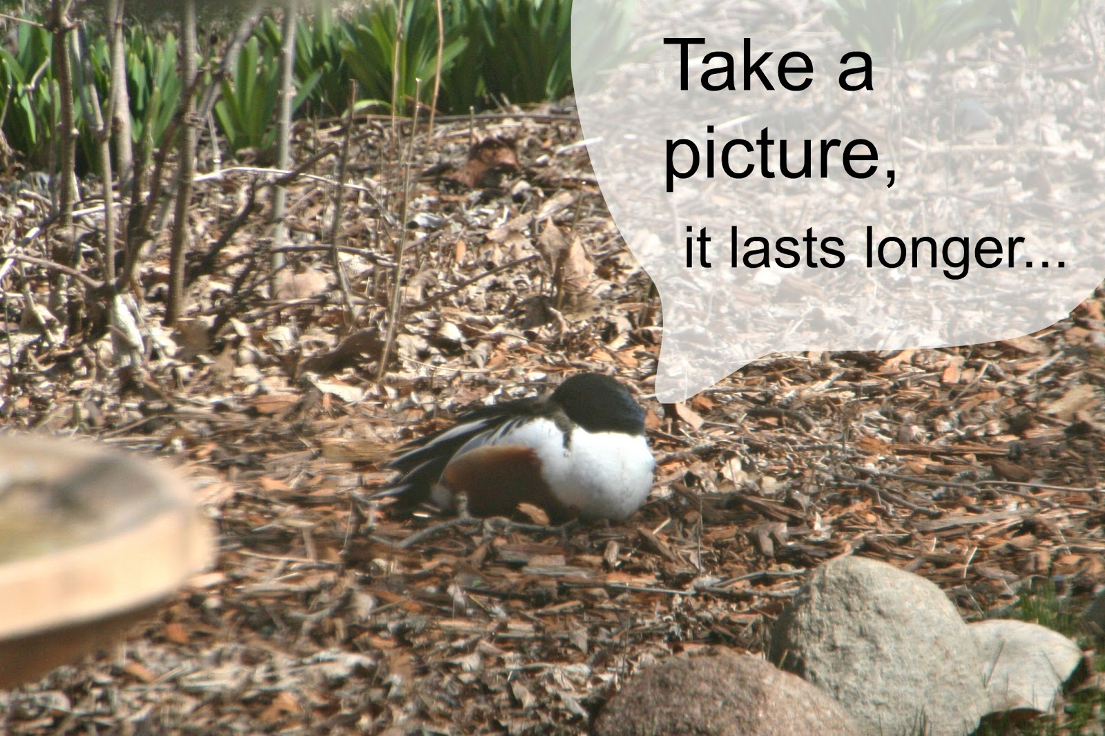 I'm drinking my coffee and looking out the window and I spot this duck. Don't know what type of duck it is...seems to be something more then a mallard. So it's a duck, but ducks don't usually hang out in my back yard. The duck didn't move. He seemed to have his head tucked under his wing....at least that is what I was hoping....I was hoping that the naughty hawk that frequents our yard didn't spot him first.....
